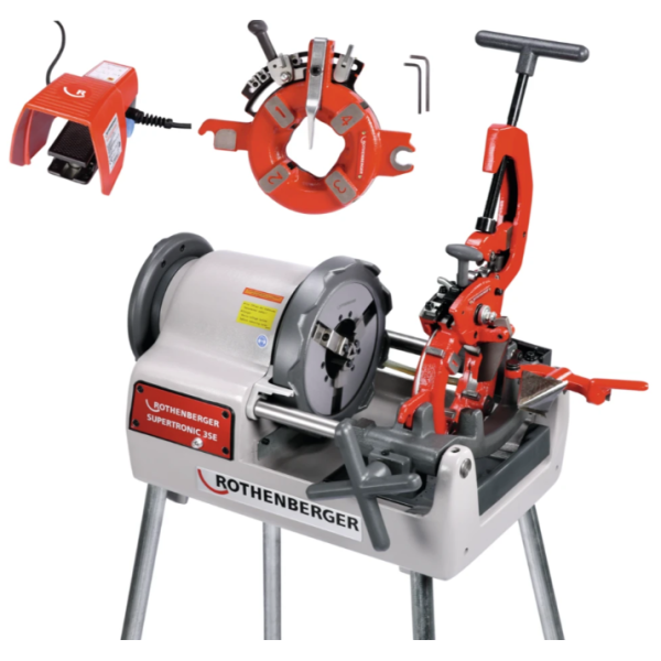 balenie obsahuje: Závitorez model Supertronic 3SE, automatická hlava ⅛ - 2“, sady nožov ½-¾“ a 1-2“, automatická hlava 2 1/2 - 3", sada nožov 2 1/2 - 3",bezpečtnostný nožny spínač, podstavcové nohy |