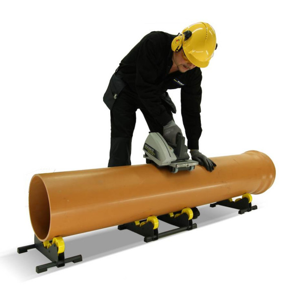 Pílový systém na rezanie a úkosovanie rúr v jednom úkone EXACT PipeCut P400 na plastové kanalizačné rúry od 100 mm do 400 mm.